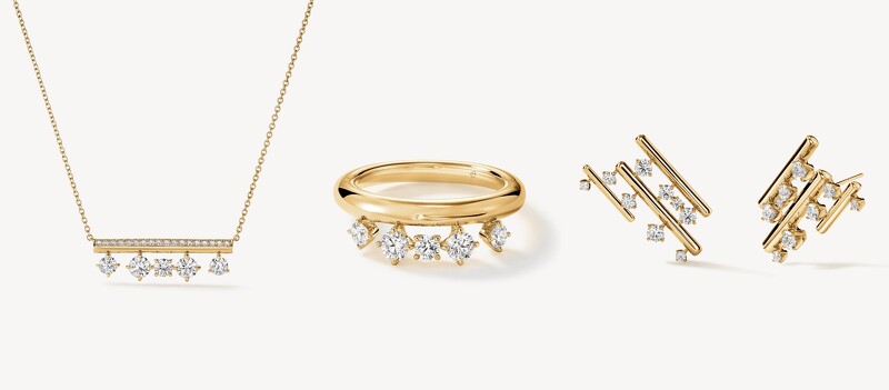BARRE Multi-Row黄K金钻石耳环 钻石总重约2.00ct NTD532,000、BARRE Multi-Row黄K金钻石戒指 钻石总重约0.70ct NTD249,000、BARRE Floating黄K金钻石锁骨鍊 钻石总重约4.85ct NTD1,622,000起。 犹如当代艺术品的BARRE系列,演绎突破常规的现代摩登之美