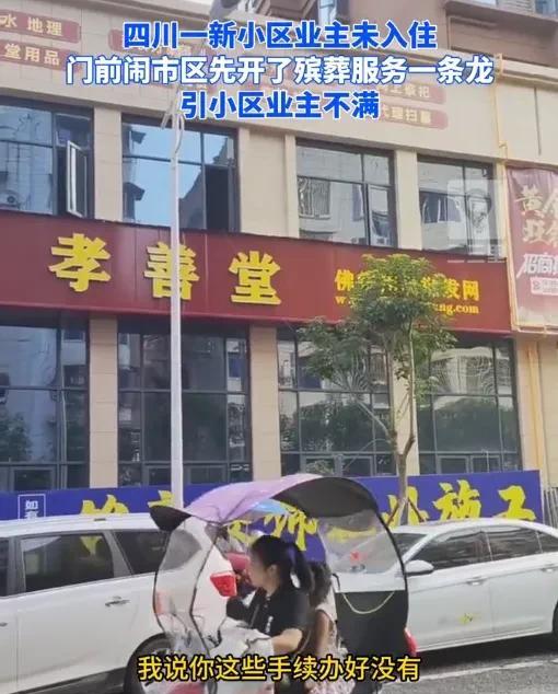四川资阳,某小区的业主高高兴兴地到物业处接房,哪知还没进入小区,就看到小区门口,位置很好的地方,开了一家“孝善堂”殡葬服务一条龙店,业主觉得快要疯了,喊话:“人还未住,鬼先登门,想钱想疯了!”